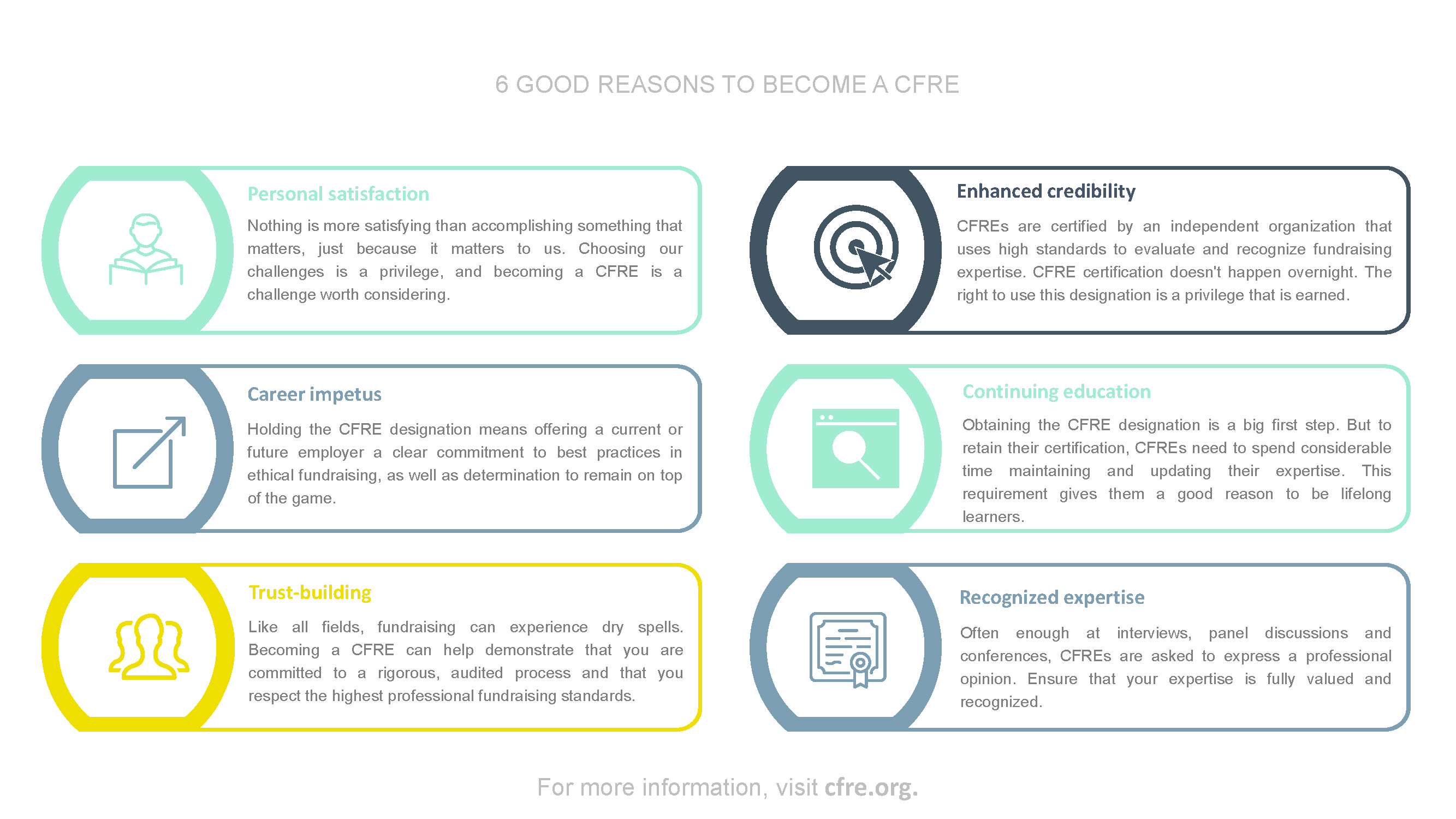 To obtain and maintain their certification, CFREs must undergo a rigorous process that evaluates their expertise in donor research, relationship-building, securing the gift, volunteer involvement, management and leadership, ethics, accountability and professionalism. For clients and donors, working with CFREs means having access to a wealth of experience and the assurance of doing business with people who care about and are committed to philanthropy.